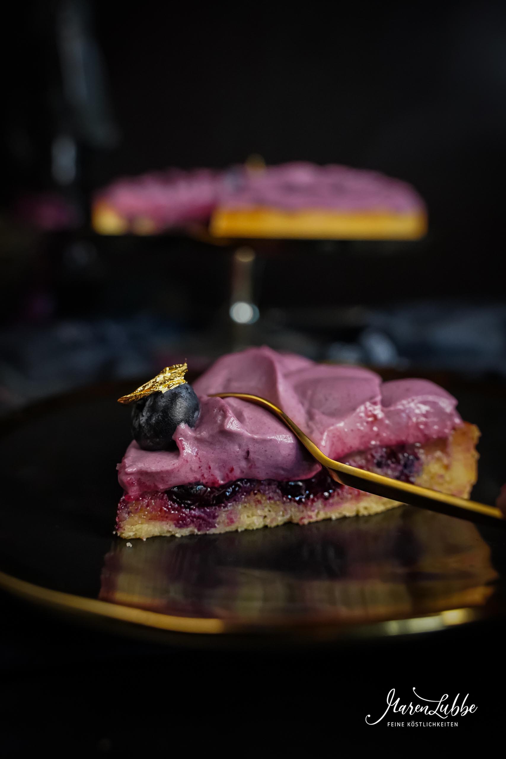 Die Tarte am besten auf einem Drehteller* platzieren und die Beerenganache von außen nach innen in flachen Bögen, wie in diesem Video gezeigt, aufdressieren. Ich habe die Bögen allerdings etwas kleiner als im Video gemacht. In die Mitte der Tarte einige Beeren legen und diese mit essbarem Blattgold1 dekorieren. Die Tarte bis zum Servieren in den Kühlschrank stellen. So hält sie sich prima und schmeckt auch am nächsten Tag sehr gut.