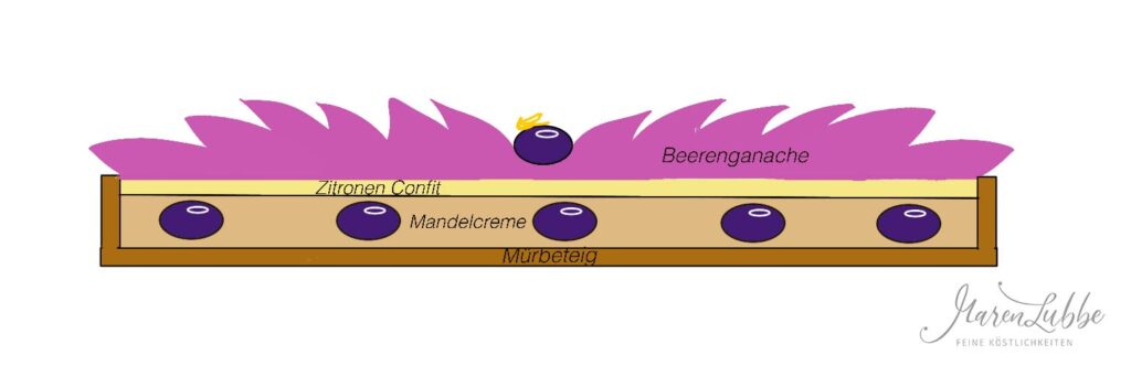 Trocken ist diese Tarte nun wirklich nicht! Vielmehr hat sie alles, was man von einer tollen Tarte erwarten darf. Knuspriger Mürbeteig, gefüllt mit einer saftigen Mandelcreme mit Beeren und einem säuerlichen Zitronen Confit, als Gegengewicht zur süß – sahnigen Beerenganache.
