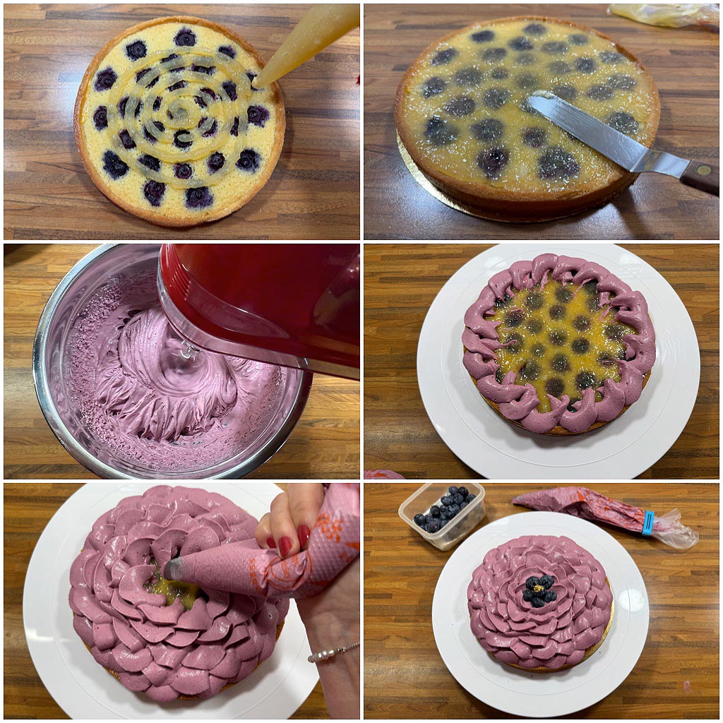 Das Zitronenconfit auf der Oberfläche der Tarte verteilen und glatt abstreichen. Die Beerenganache auf mittlerer Geschwindigkeit aufschlagen. Zwischendurch immer wieder die Konsistenz kontrollieren. Sie sollte nicht zu weich sein, damit das Blütenmuster nicht verschmilzt, aber auch nicht zu fest. Wenn die richtige Konsistenz erreicht ist, die Ganache in einen Spritzbeutel mit St. Honoré Tülle 1405* füllen und diesen noch einmal für 10 Minuten in den Kühlschrank legen.