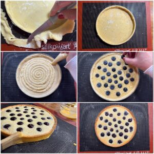 Nach der Kühlzeit den Teig gleichmäßig 3-4 mm dick ausrollen. Den Tartering auf ein mit Backpapier belegtes Blech legen, fetten und sorgfältig mit dem Teig auslegen. (Ich verwende eine Airmat Silikonmatte* speziell für Mürbeteig und lege diese auf ein Lochblech*. So wird der Mürbeteig schön knusprig.) Die Kanten sauber abschneiden, den Boden mit einer Gabel mehrfach einstechen und die Form noch einmal 15 Minuten in den Kühlschrank stellen. Währenddessen die Mandelcreme zubereiten.