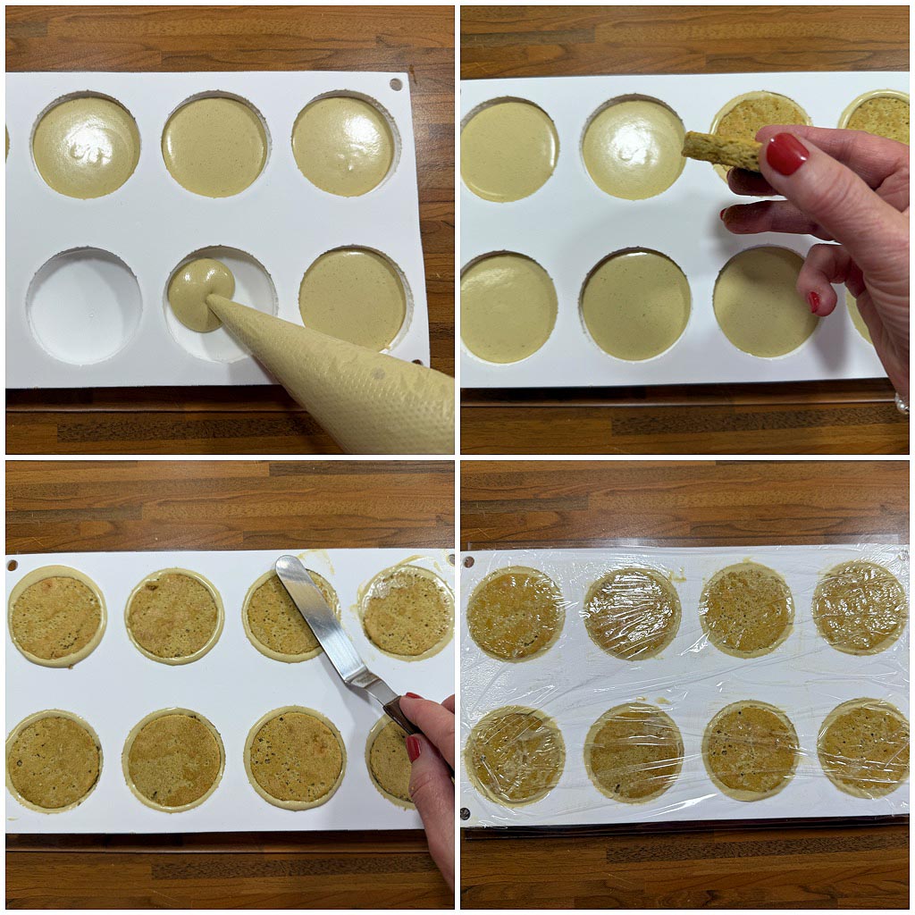 Die Mulden der Macaron Silikonform ca. zur Hälfte mit Vanillemousse bzw. Pistazienmousse füllen und je einen Knusperbiskuitkreis mit der Knusperschicht nach unten in die Mousse drücken. Glattstreichen und mit Frischhaltefolie bedeckt eine Nacht in den Gefrierschrank legen.
