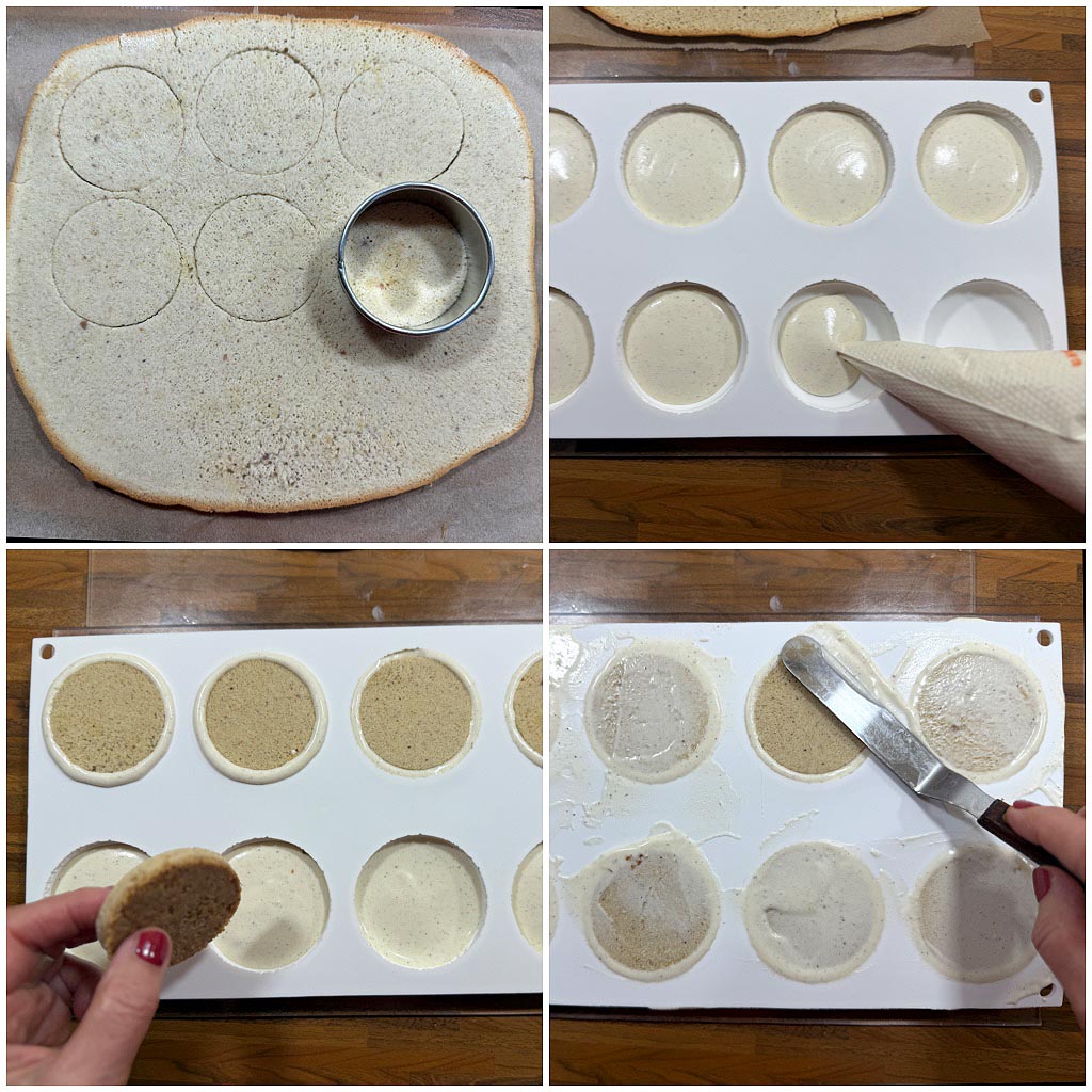 Den Knusperbiskuit aus dem Gefrierschrank nehmen und 8 Kreise mit 5,5 cm Durchmesser ausstechen.