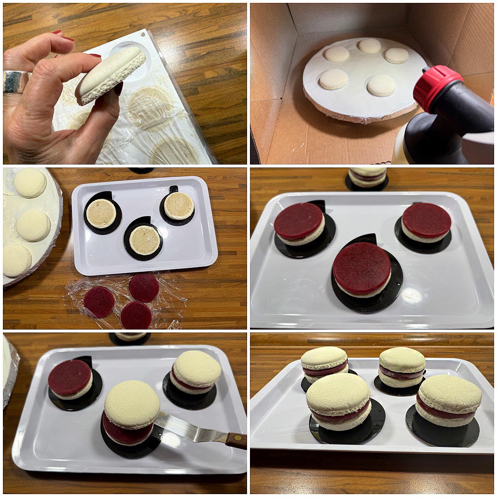 Verwendete Silikonform: Silikomart Macaron 110* (dieses Kit besteht aus zwei Silikonmatten: „Macaronschalen“ und Füllung, sowie 4 Plastik-Serviertellerchen)