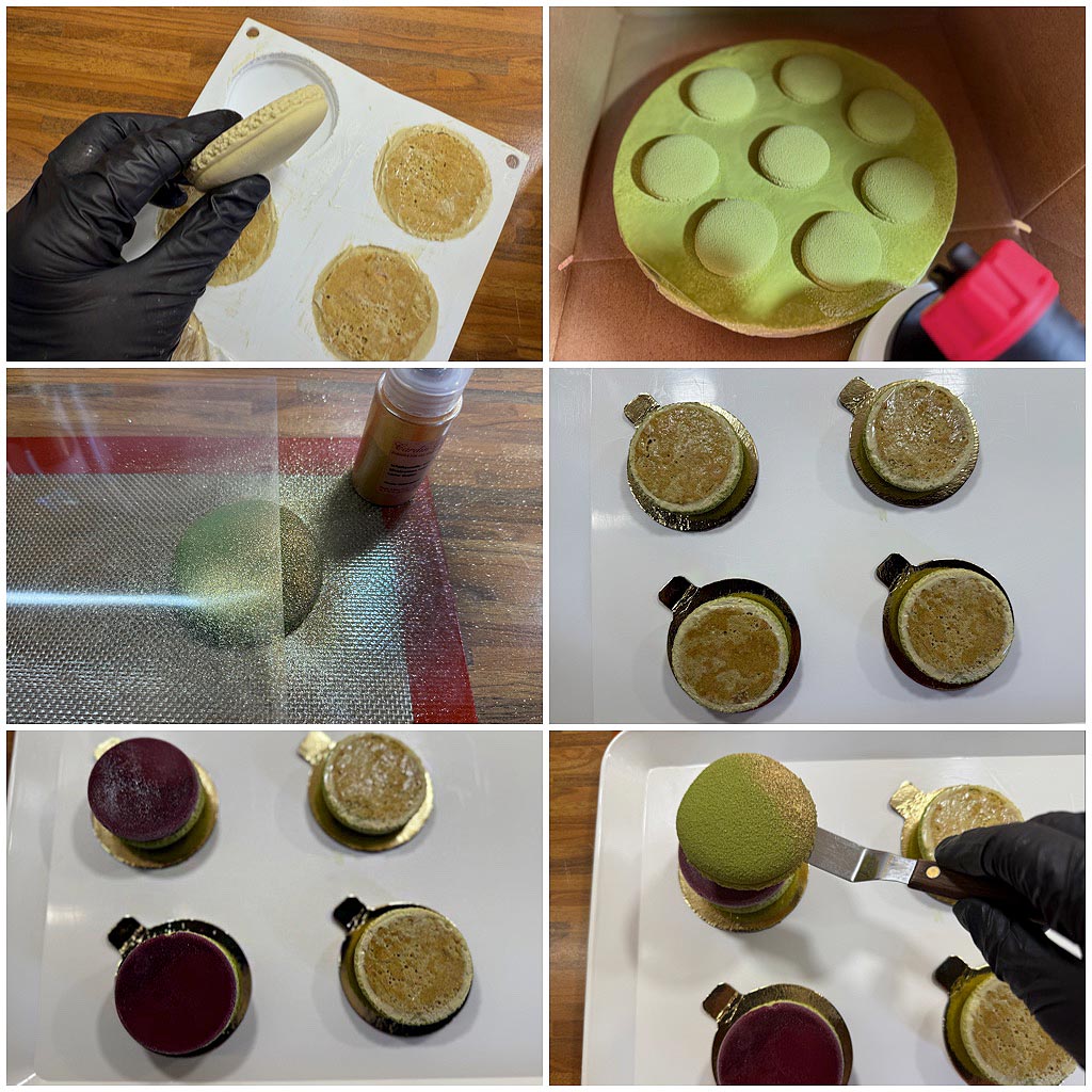 Die gefrorenen „Macaronschalen“ aus Mousse aus der Silikonform lösen und sogleich mit Velvetspray besprayen. Die Pistazienmacaron-Törtchen habe ich zur Hälfte noch mit Perlglanzpuder bestäubt.