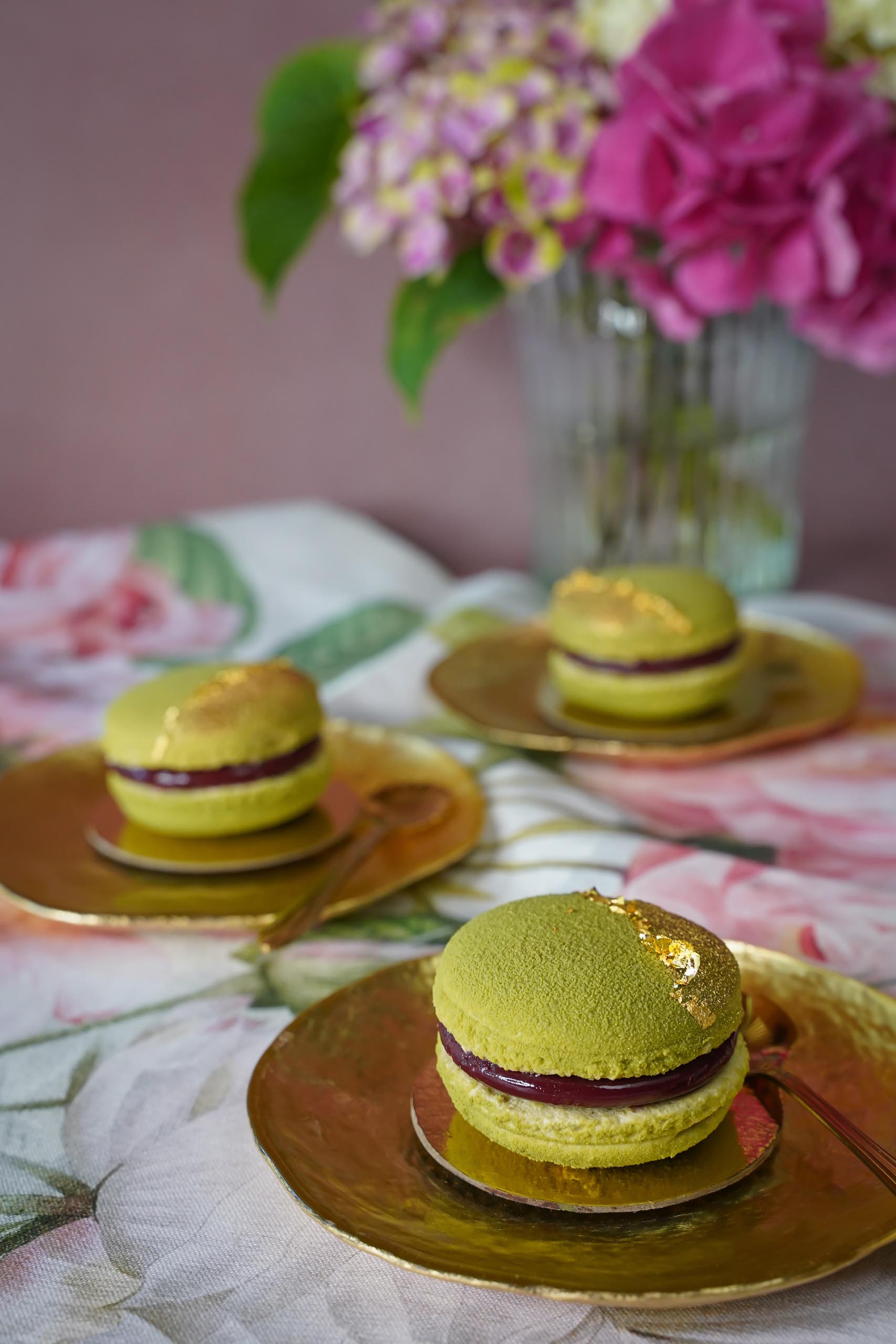 Vier Macaronschalenhälften mit der Velvetseite nach oben auf ein Serviertellerchen legen, die anderen vier Hälften bis zur Verwendung nochmals in den Gefrierschrank legen. So tauen sie nicht an und lassen sich später sauber auflegen! Die gefrorenen Fruchtschichten ausformen und mittig auf die Hälften platzieren. Jetzt die zweiten Macaronhälften auflegen und mit Blattgold dekorieren. Die Törtchen auftauen lassen und servieren.