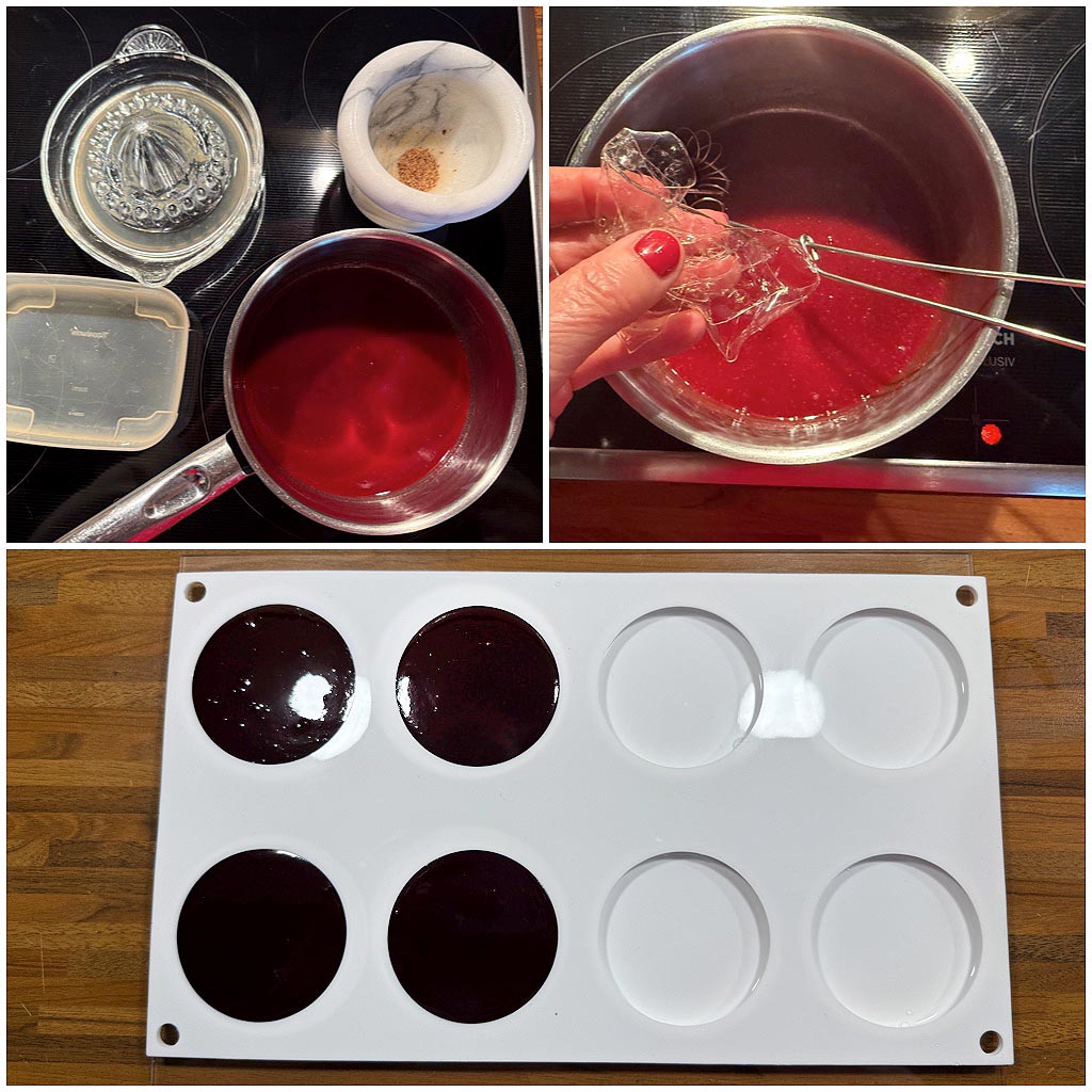 Die Gelatine in eiskaltem Wasser einweichen. Den Kampotpfeffer fein mörsern und zusammen mit dem Fruchtpüree und dem Zitronensaft erhitzen. Eventuell etwas Zucker ergänzen, je nach Süße der Früchte. Die heiße Fruchtmasse noch einmal durch ein Sieb gießen und die gut ausgedrückte Gelatine darin auflösen. Das Confit auf vier der flachen Mulden der Silikonform Macaron 110 verteilen und einfrieren.
