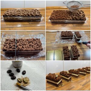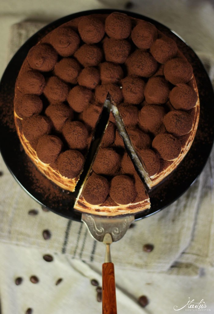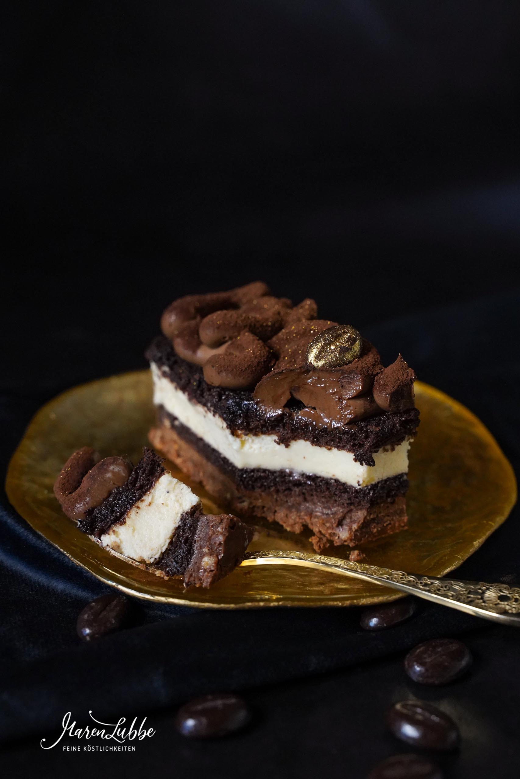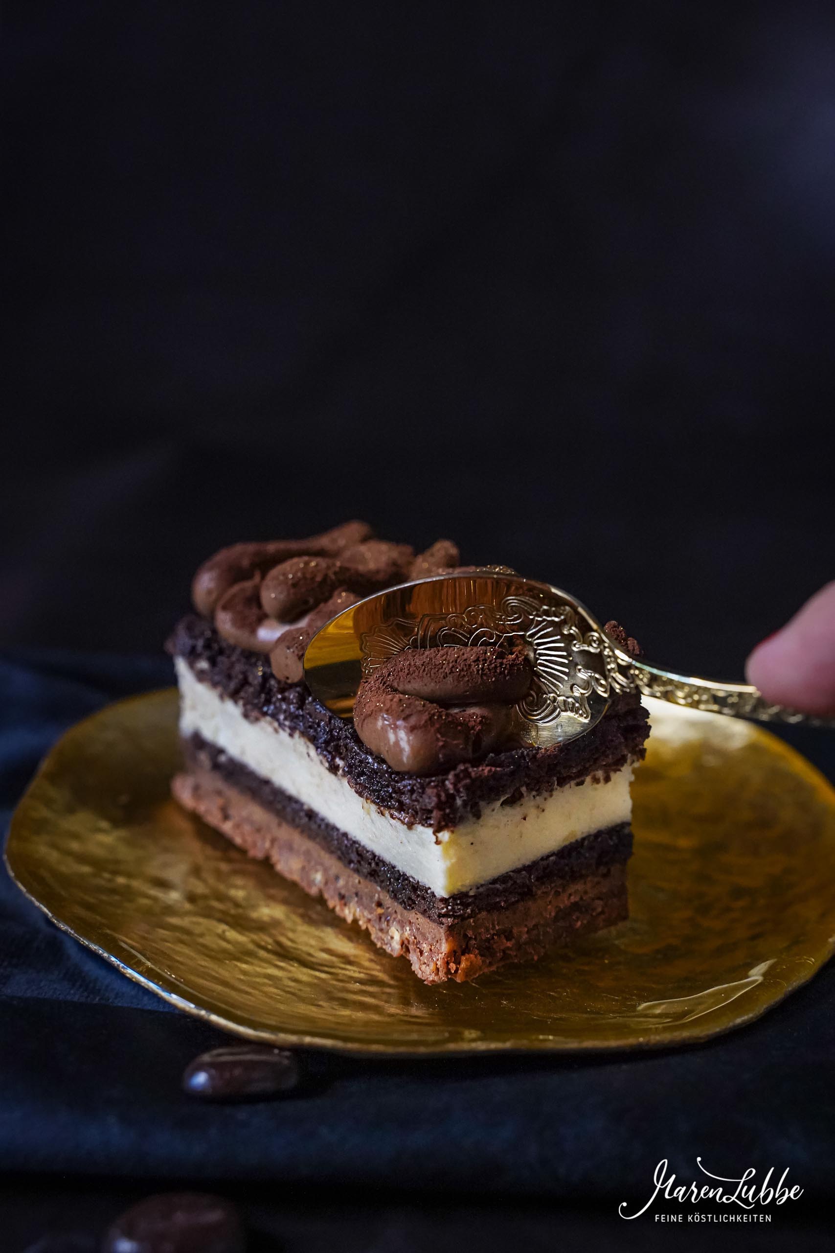 Mit einem dünnen, scharfen Messer am Rand des Backrahmens entlangfahren und den Rahmen dann abheben. Dies untergelegte Frischhaltefolie jetzt entlang der Schnittkanten hochklappen. So bleibt kein Kakao daran hängen. Die Oberfläche der Torte mit Kakao übersieben und mit etwas Goldpuder bestäuben. Die Schokoladen-Mokkabohnen ebenfalls mit Goldpuder bepinseln. Die Torte jetzt in sechs gleich große Schnitten mit 4 cm Breite schneiden. Hierzu eignet sich besonders gut ein sehr scharfes Konditormesser1, welches vor jedem Schnitt in warmes Wasser getaucht und sauber abgewischt wird. Ich habe die Schnitten auf kleine goldene Pappuntersetzer* abgesetzt und vor dem Servieren mit den goldenen Mokkabohnen garniert.