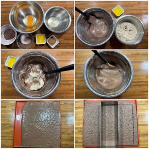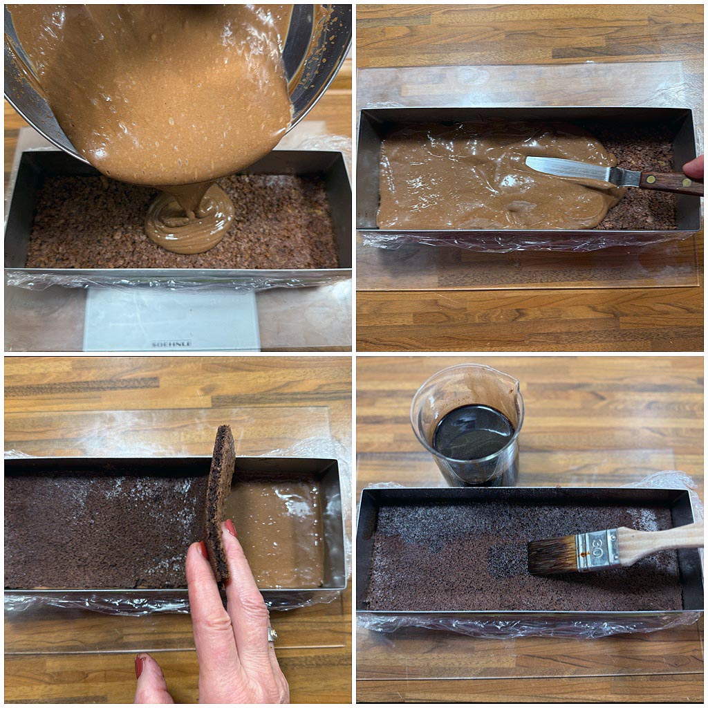 Den Backofen auf 180 Grad Ober-/ Unterhitze aufheizen. Das Eiweiß mit dem Muscovadozucker zu festem Eischnee verschlagen. Eigelb, Ei und Zucker sowie Vanillezucker hellschaumig aufschlagen. Den Eischnee unterheben, Mehl und Kakao darüber sieben und zusammen mit der geschmolzenen, leicht abgekühlten Butter unter die Eimasse ziehen. Die Biskuitmasse gleichmäßig knapp 1 cm dick auf eine Silikonmatte mit Rand streichen und ca. 10 Minuten im heißen Backofen backen. Abkühlen lassen und mithilfe des rechteckigen Backrahmen zwei Rechtecke ausstechen.