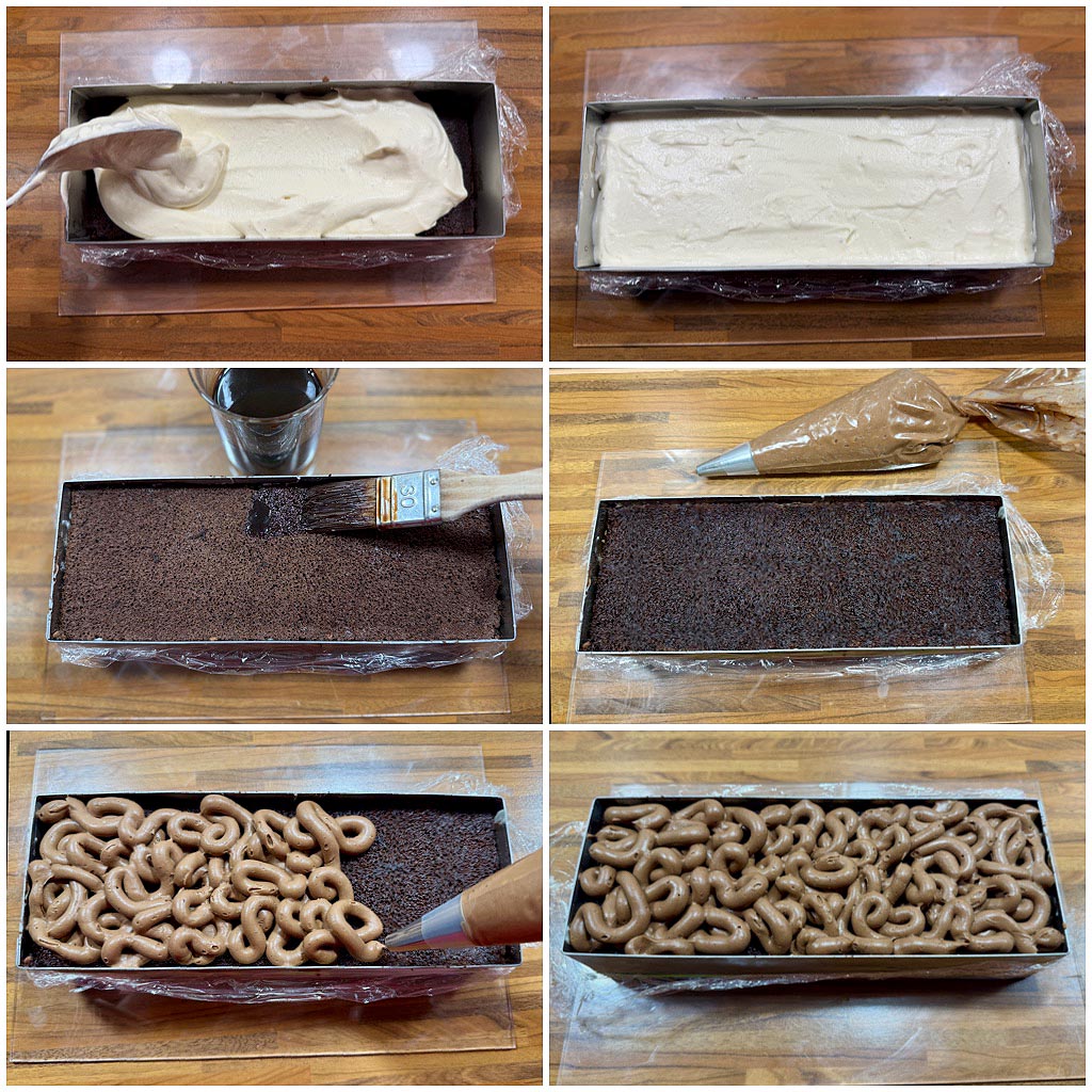 Die Cremeux in Schlangenlinien frei Hand auf den Biskuit dressieren. Den Backrahmen anschließend für mindestens 2 Stunden in den Kühlschrank stellen.