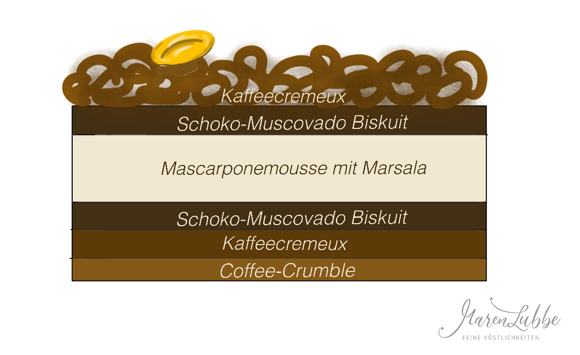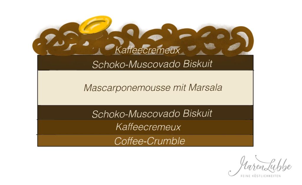 Den rechteckigen Tortenrahmen auf einer Seite mit Frischhaltefolie bespannen und auf eine Platte stellen. Den Coffee-Crumble einfüllen und gleichmäßig auf dem Boden verteilen. Gut festdrücken! Anschließend 100 g Kaffeecremeux auf dem Crumble verteilen. Darauf einen ausgestochenen Biskuit legen und diesen mit der Kaffee-Marsala Tränke bestreichen. Das restliche Kaffeecremeux bis zur Verwendung kühl stellen.