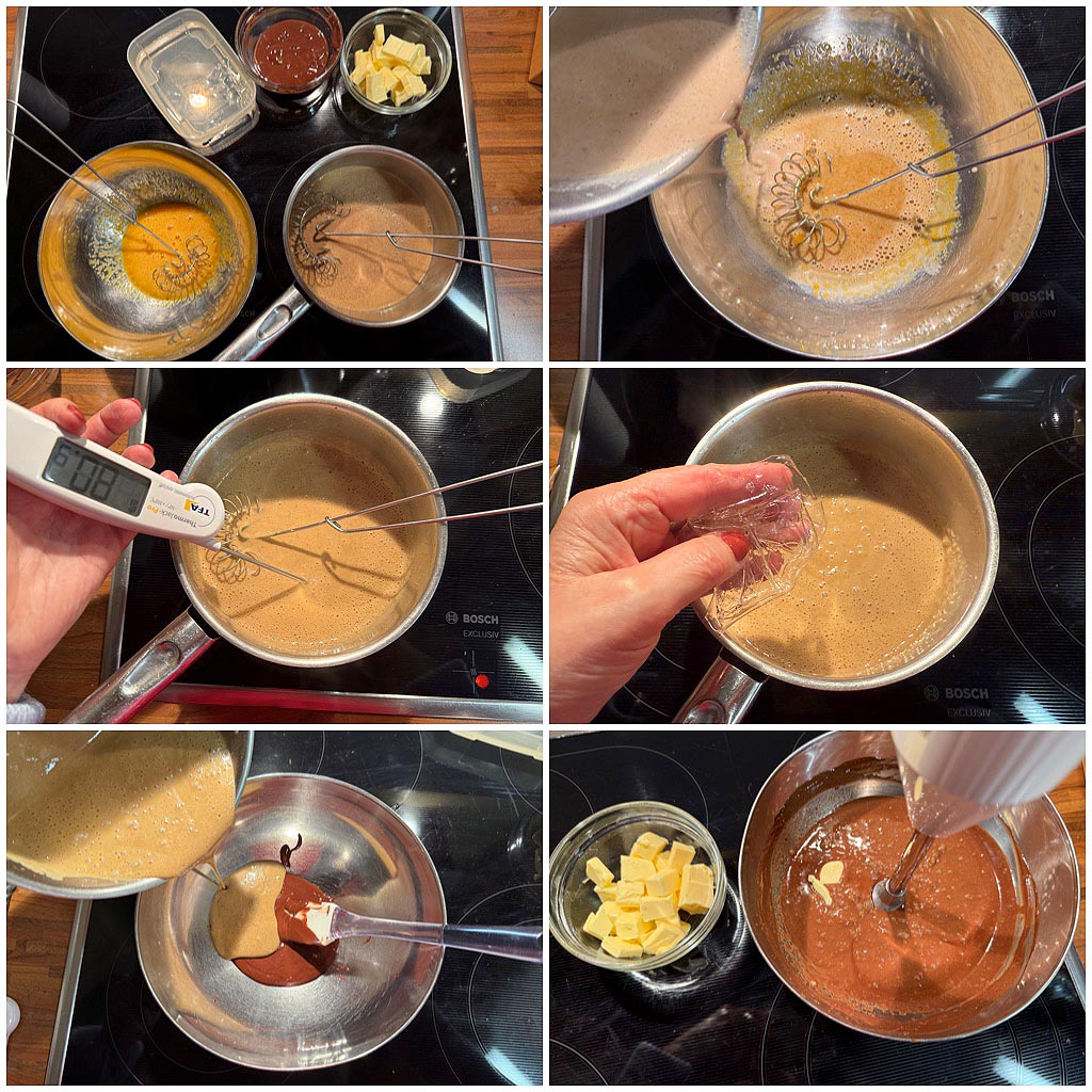 Die Gelatine in eiskaltem Wasser einweichen, die Kuvertüre schmelzen. Das Eigelb mit dem Zucker in einer Schüssel verrühren. Die aromatisierte Sahnemilch aufkochen und dann in die Eigelbmasse rühren. Alles zurück in den Topf geben und bei mittlerer Hitze und unter stetem Rühren auf 83 Grad erhitzen. Vom Herd nehmen und die gut ausgedrückte Gelatine in der Creme auflösen und diese in die Kuvertüre rühren. Sobald die Kaffeecreme auf 40 Grad abgekühlt ist, nach und nach die Butterwürfel mit dem Stabmixer einarbeiten.