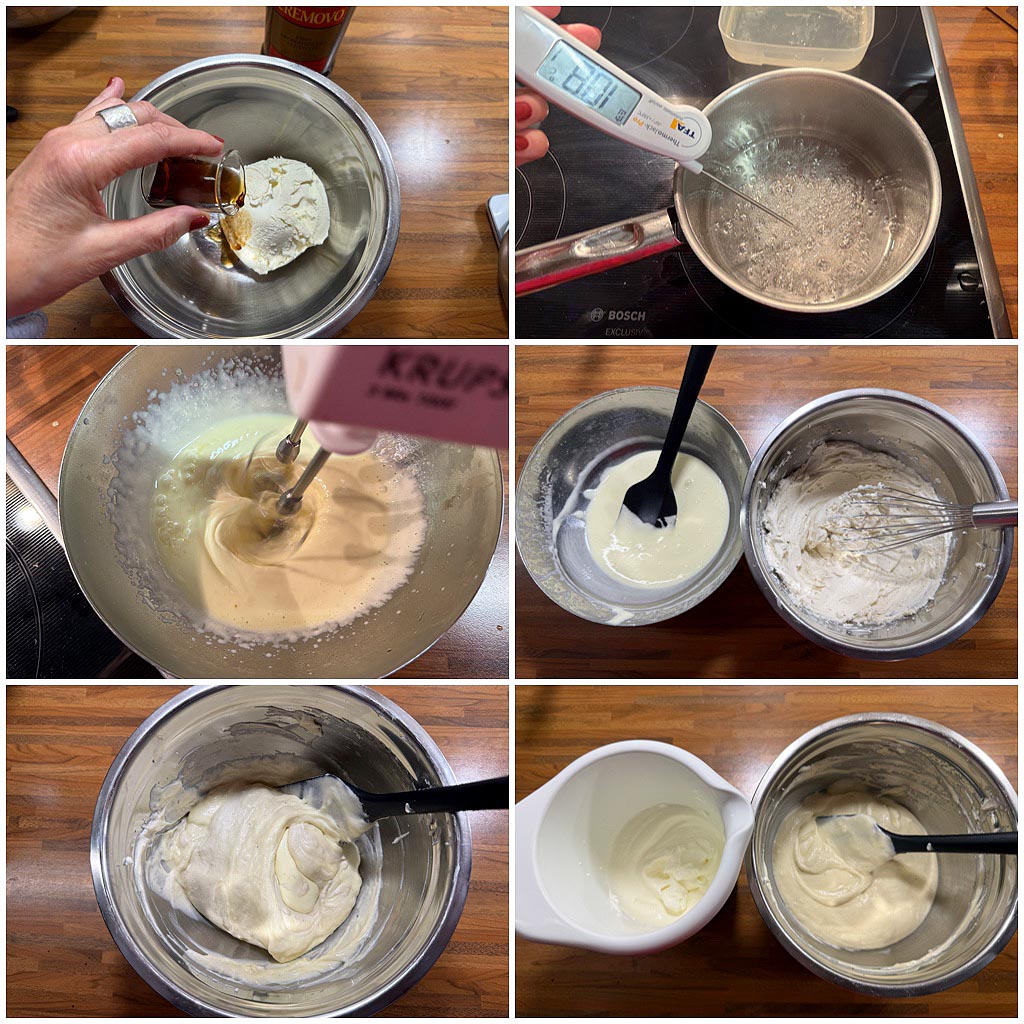 Zucker und Wasser in einem Topf auf 118 Grad kochen. Das Eigelb mit dem Mixgerät aufschlagen und den heißen Sirup in feinem Strahl hineingießen. Die Gelatine ebenfalls hinzugeben und kräftig mixen, bis die Pâte à bombe abgekühlt ist. Diese nach und nach unter die Mascarponecreme ziehen. Zum Schluss die Sahne halbsteif schlafen und ebenfalls unterheben.