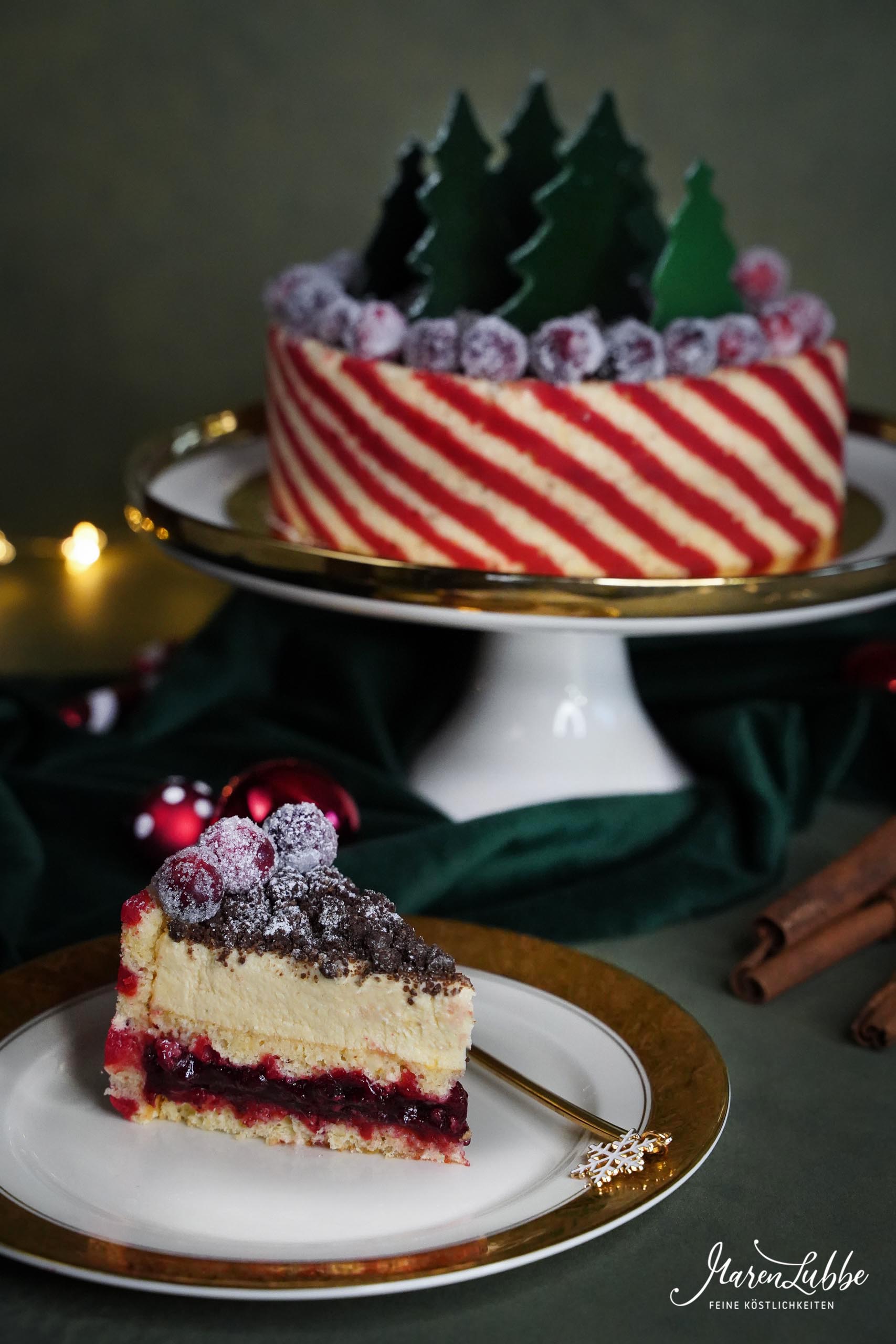 In diesem Jahr habe ich diese festliche, kleine Torte für euch kreiert. Wenn es um Weihnachtsfarben geht, schwöre ich ja auf Rot – Grün – Gold. Und so kommt auch meine Weihnachtstorte in klassischem Look daher. Rot gestreifter Dekorbiskuit, gekrönt von einem Wäldchen aus grünen Schokoladen-Tannenbäumchen auf Schokocrumble. Das Beste aber ist die herrlich aromatische Marzipanmousse, die als Pendant zum feinherben Cranberrykompott einfach der Hammer ist! Dabei ist die Torte, vielleicht mal abgesehen vom Dekorbiskuit, wirklich nicht kompliziert oder allzu zeitaufwändig. Ich habe sie an einem Vormittag gebacken.