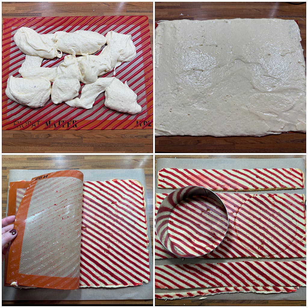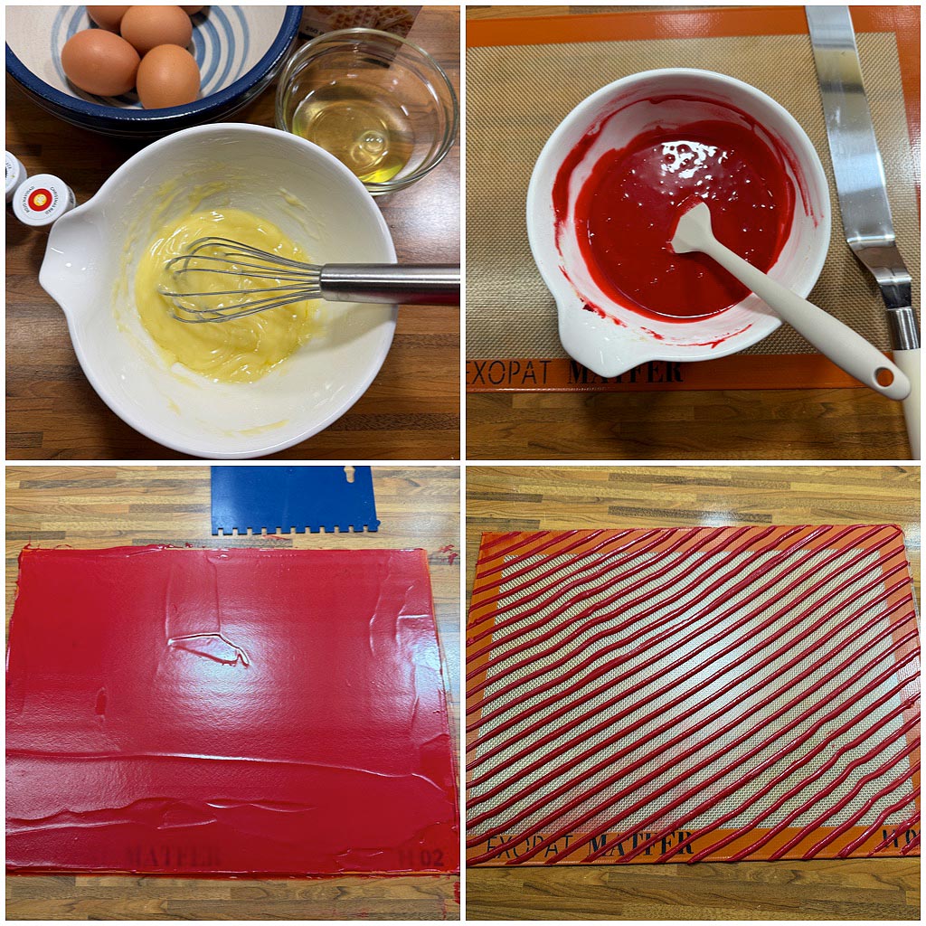 Butter und Puderzucker gut verrühren. Das (ungeschlagene) Eiweiß hinzugeben und ebenfalls unterrühren. Das Mehl einmelieren und die Masse mit der roten Lebensmittelfarbe einfärben. Den Teig mit einer großen Palette oder einer Teigkarte ca. 1 mm gleichmäßig dünn auf eine 30 × 40 cm Silikonmatte* streichen. Mit einem Zahnspachtel* (gibt’s auch günstig im Baumarkt) schräg durch die rote Masse streichen, sodass ein Streifenmuster entsteht. Dabei sollte die Größe von 30 × 40 cm voll ausgenutzt werden, da man diese Fläche an Biskuit später unbedingt benötigt! Die Silikonmatte auf einer Platte liegend, für 45-60 Minuten in den Gefrierschrank legen, damit das Muster später nicht durch den Biskuitteig verschmiert. Dann kann der Biskuit zubereitet werden.