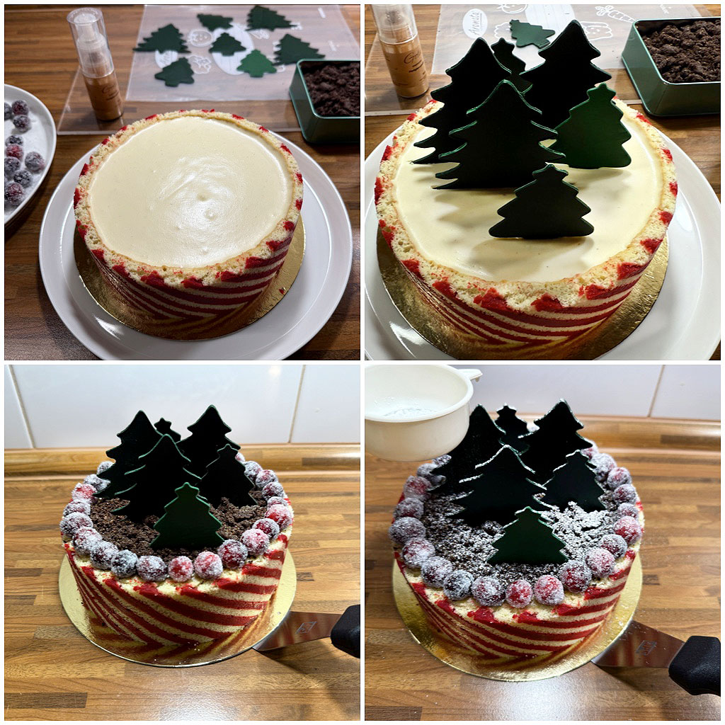 Die Schokoladentannenbäume leicht in die Oberfläche der Marzipanmousse drücken, sodass sie fest stehen. Den Crumble zwischen den Tannenbäumchen verteilen und den Rand der Torte mit den gezuckerten Cranberries verzieren. Zum Schluss mit Puderzucker bzw. Dekorschnee (hält sich besser) und Silber- oder Goldperlglanz bestäuben. Die Torte kann jetzt serviert werden.