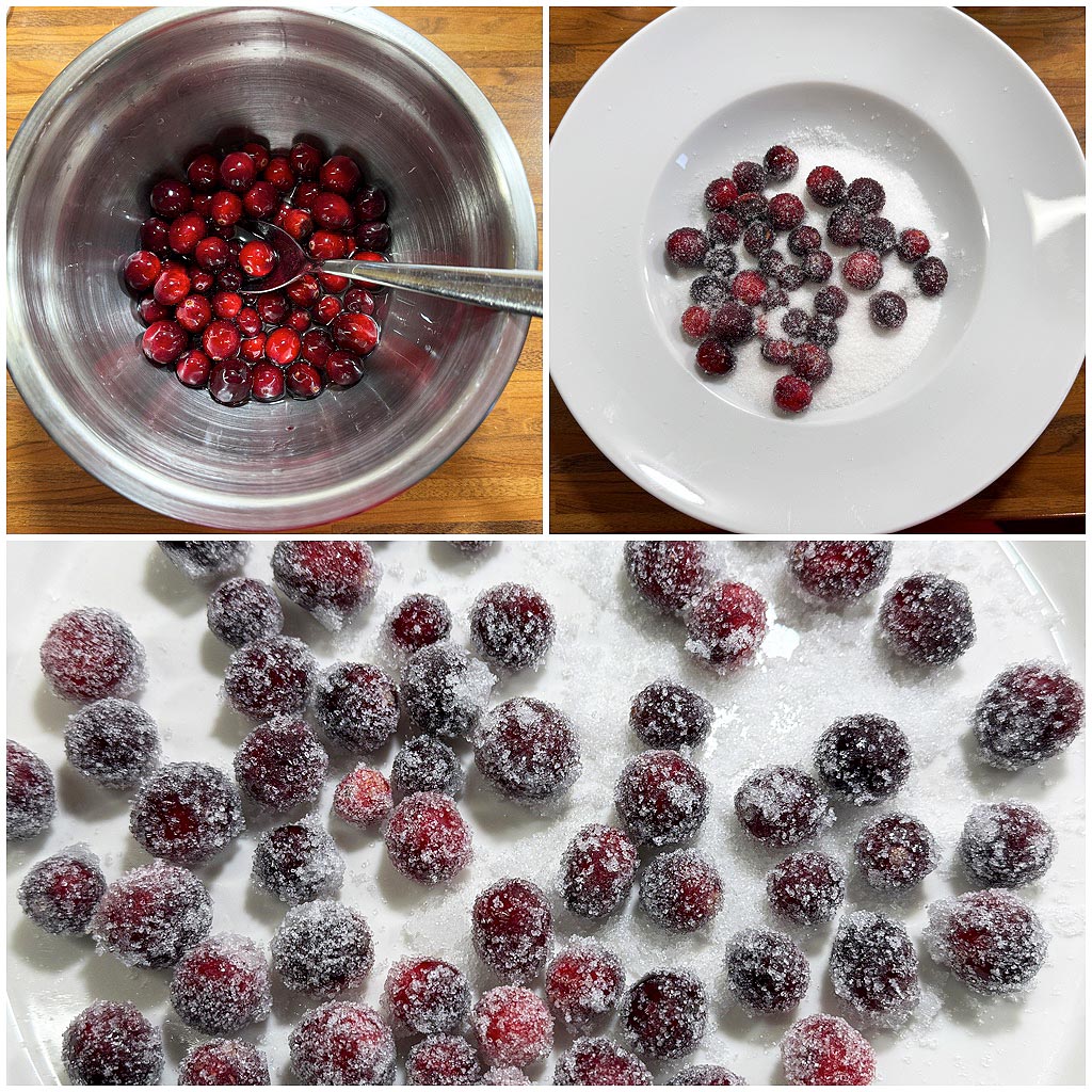 Wasser und Zucker zu Sirup kochen. Vom Herd nehmen, die Cranberries hineingeben und mit dem Sirup benetzen. Anschließend die Beeren abtropfen lassen und in Zucker wälzen. Überschüssigen Zucker abschütteln und die gezuckerten Cranberries auf einem Teller trocken lassen.