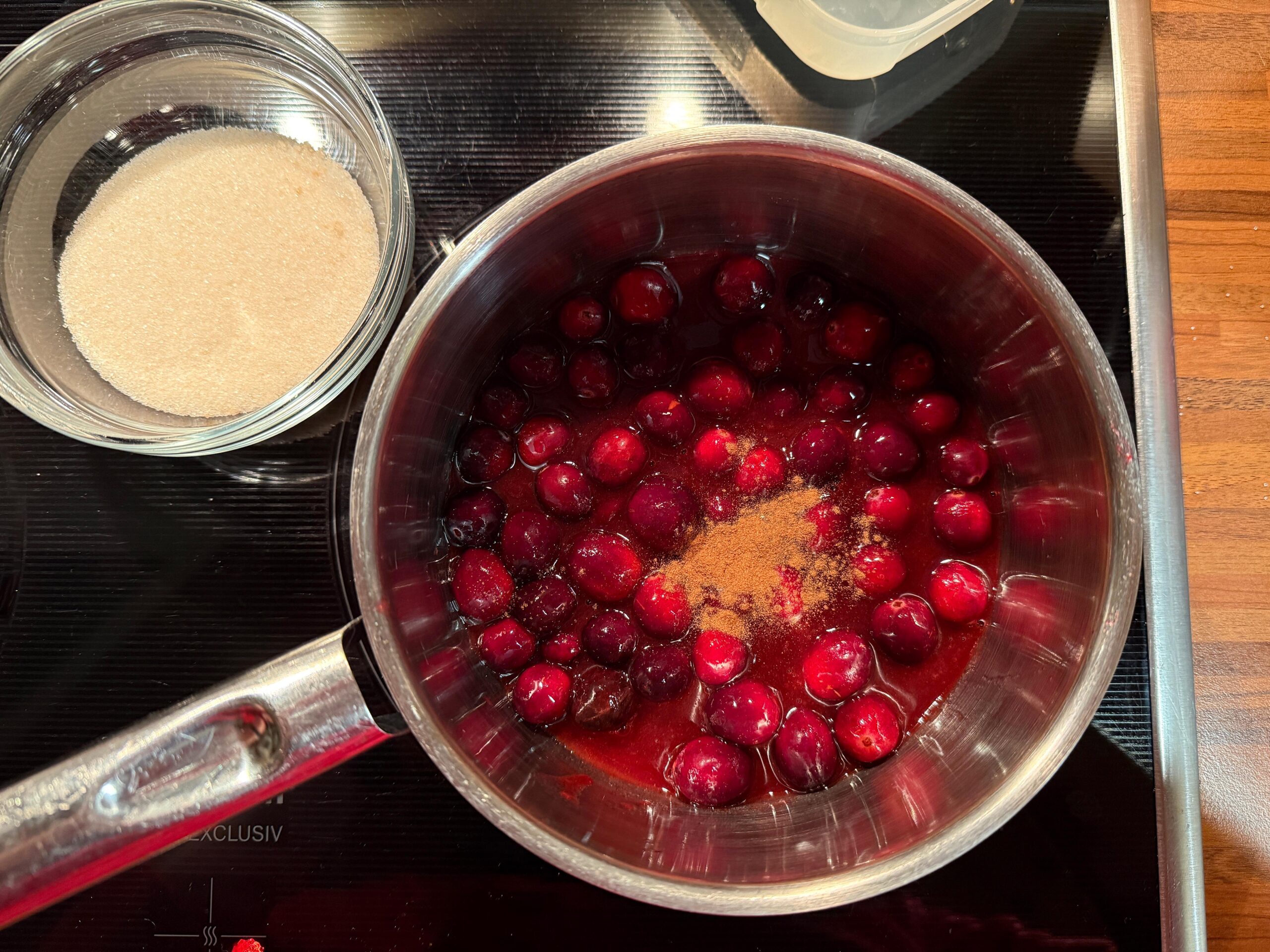 Ich bin ja auch eine große Liebhaberin von Cranberries. Sie sind im Zuckermantel nicht nur eine hübsche Deko, sie schmecken auch sehr gut. Die restlichen Zuckerfrüchtchen nasche ich immer so zwischendurch 😇. Das Cranberrykompott habe ich mit Zwetschgenpüree gekocht, welches ich noch vorrätig hatte. Ihr könnt aber auch auf ein rotes Fruchtpüree nach eurer Wahl zurückgreifen. Ich könnte das Kompott mit Löffeln essen, so gern mag ich es!