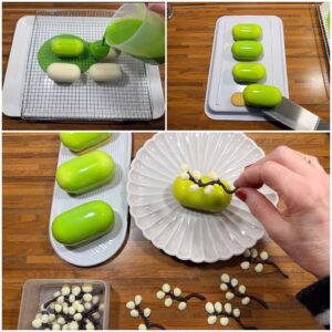 Die Mirror glaze im Wasserbad oder der Mikrowelle sanft erwärmen, sodass sie wieder flüssig wird. Die Gießtemperatur liegt um 30 Grad herum. Dies ist ein Richtwert – die Glasur sollte wie Sahne fließen!