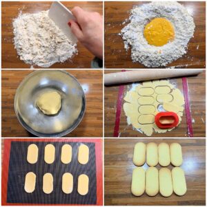Mehl und kalte Butterflocken mit einer Teigkarte auf der Arbeitsfläche miteinander vermengen. Dabei die Butter mit der Teigkarte hacken, sodass Streusel entstehen. Puderzucker und Eigelb vermengen und mit dem Salz zu den Streuseln geben. Alles schnell miteinander verkneten. Den Teig 1–2 Stunden kühlen.