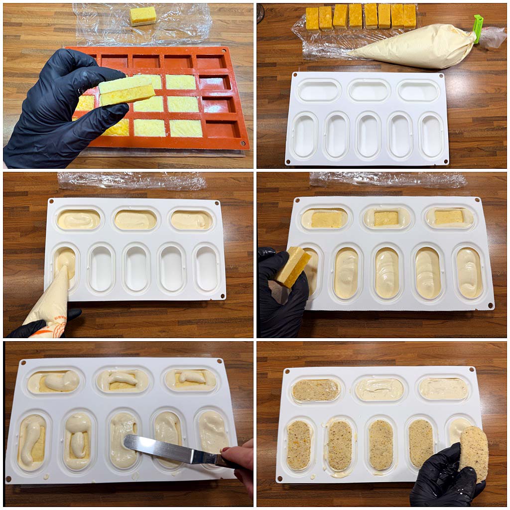 Die Mulden der „Pillow“-Silikonform etwa zu zwei Drittel mit der Orangenmousse füllen und je einen der gefrorenen Orangeneinlagen in die Mousse drücken. Mit etwas Mousse bedecken und mit einem kleinen Haselnussbiskuitboden abschließen. Die Form über Nacht einfrieren.