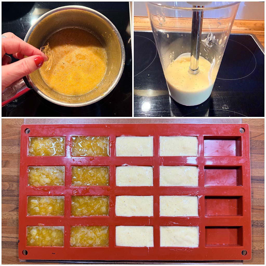 Die Gelatine einweichen. Das Kompott zusammen mit der Mascarpone nochmals pürieren. Die Hälfte der Creme zusammen mit dem geriebenen Ingwer erwärmen und die Gelatine darin auflösen. Mit der restlichen Creme verrühren und weitere acht Mulden der „Barren“-Silikonform befüllen. Die Silikonform einfrieren, bis die Creme und das Kompott fest sind.