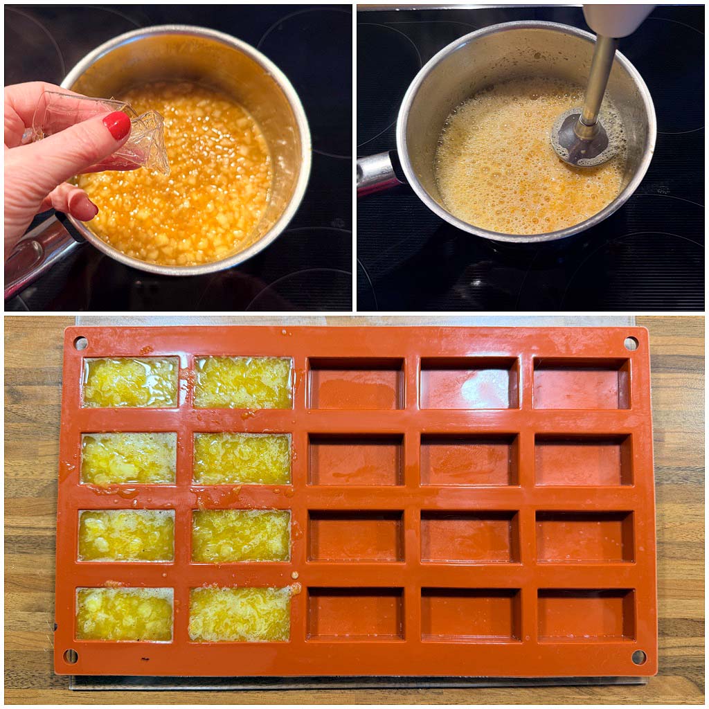Die Gelatine in eiskaltem Wasser einweichen. Die Orange filetieren und klein schneiden. Zusammen mit den Apfelwürfelchen, den Säften, dem Ingwer, dem Orangenabrieb und dem Zucker im offenen Topf aufkochen und ca. 5–7 Minuten leise köcheln lassen. Vom Herd nehmen, die gut ausgedrückte Gelatine hinzugeben und das Kompott mit dem Stabmixer durchpürieren – ergibt ca. 200–220 g. Das Kompott in acht Mulden der „Barren“-Silikonform füllen. Nicht zu hoch befüllen, damit die Einlage später nicht zu hoch wird!