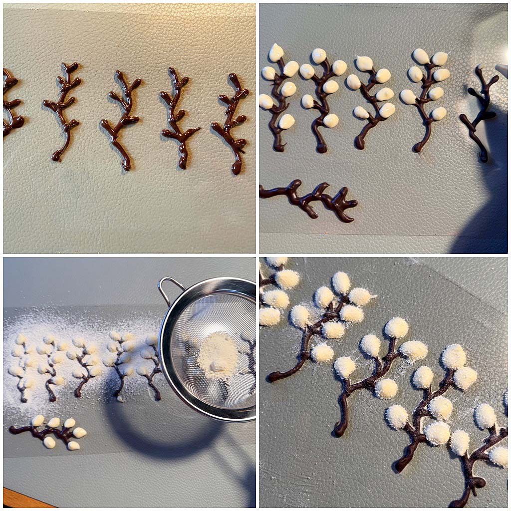Die Kuvertüren jeweils mithilfe der Mycryo-Kakaobutter temperieren. (Natürlich kann auch mit einem anderen Verfahren temperiert werden!) Die Kuvertüre jeweils in einen kleinen Spritzbeutel füllen und mit der Zartbitterkuvertüre kleine Zweige auf Folie dressieren. Sobald diese fest geworden sind, mit der weißen Kuvertüre kleine „Kätzchen“ an die Zweige spritzen. Solange die weiße Kuvertüre noch feucht ist, mit der Mycryo-Kakaobutter oder mit geriebener weißer Schokolade übersieben. Die Weidenkätzchenzweige aus Schokolade an einem kühlen Ort auskristallisieren lassen.