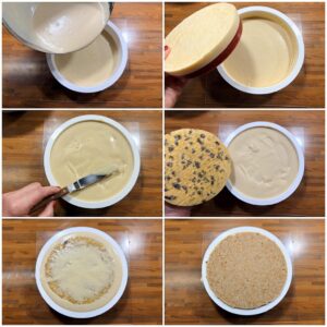 Die weiße Kuvertüre schmelzen und mit dem Praliné verrühren. Fein geriebene Streusel, zerbröselte Crêpes dentelles und Salz zur Kuvertüre geben. Alles gut vermengen und die Masse anschließend zwischen zwei Schichten Backpapier gleichmäßig 3–4 mm dick ausrollen. Auf einer flachen Platte liegend in den Kühlschrank legen. Sobald der Boden fest ist, einen Kreis mit 17 cm Durchmesser ausschneiden und wieder in den Kühlschrank, besser aber in den Gefrierschrank legen. Dann zerbricht er nicht so leicht beim Auflegen.
