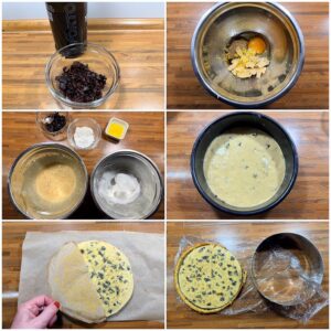 Die Marzipanmasse fein raspeln und mit den Eiern, dem Zitronenabrieb und dem braunen Zucker hellschaumig aufschlagen. Mehl und Stärke darüber sieben und zusammen mit der geschmolzenen Butter sanft zu einer glatten Masse verrühren. Die Biskuitmasse in die Springform füllen, glattstreichen und mit den mazerierten Pflaumenstückchen belegen. Im Backofen ca. 10–15 min. backen. Abkühlen lassen und dann einen Kreis mit 16 cm Durchmesser ausstechen.