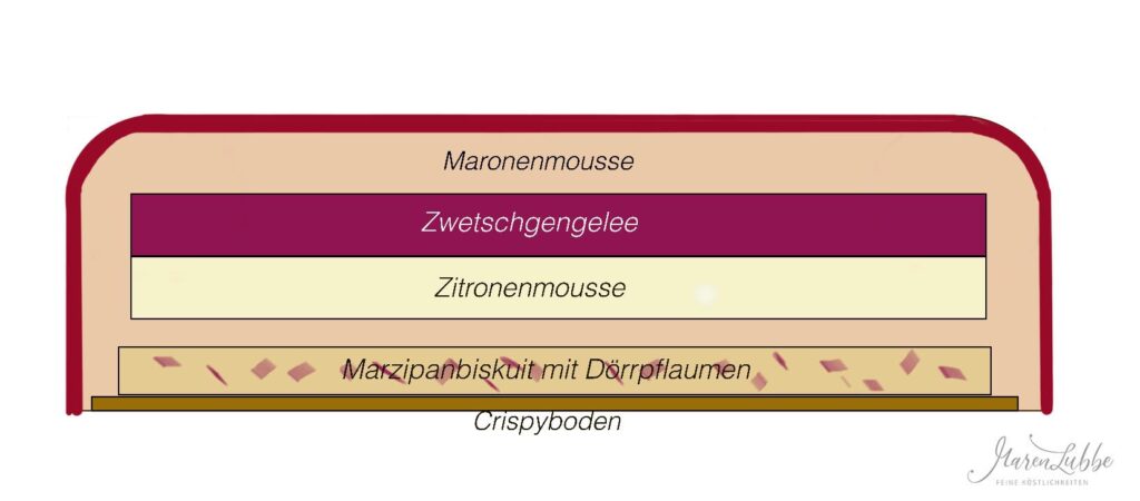 Die Einlage der „Rubina“-Torte besteht aus einem Zwetschgengelee und einer Zitronenmousse. Beides kombiniert die säuerliche Frische zur nussigen Maronenmousse. Der Biskuit ist mit, in Portwein eingelegten, Dörrpflaumen veredelt und der Crispyboden sorgt für den leckeren Crunch in der Torte. Das Dekor ist auch für Anfänger geeignet, den Schokoladenring mal ausgenommen 😉.