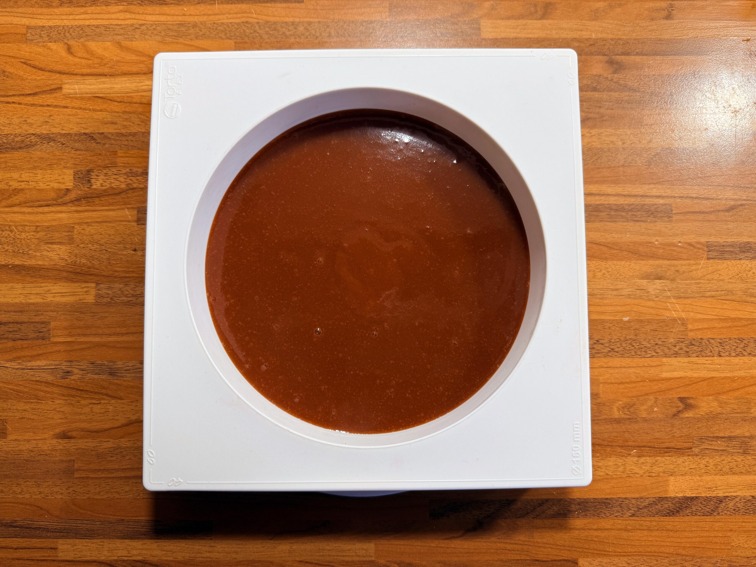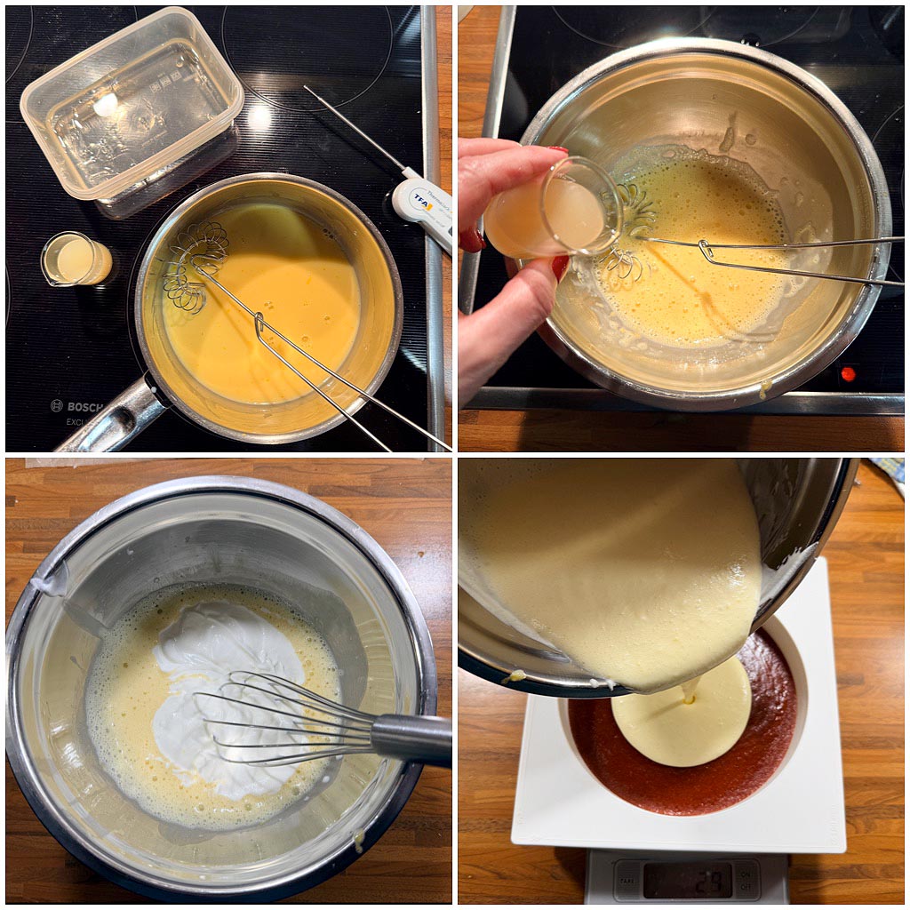 Die Mirror glaze im Wasserbad oder in der Mikrowelle auf 45 Grad erwärmen, bis sie wieder flüssig ist. Zum Gießen sollte sie eine Temperatur zwischen 26 und 32 Grad haben. Die Konsistenz entscheidet über den Gießzeitpunkt. Die Glasur soll wie Sahne fließen.