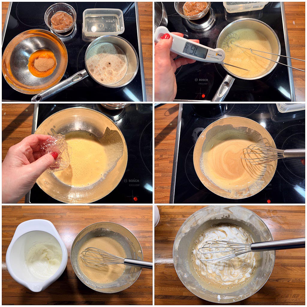Die Gelatine einweichen. Milch, Sahne und Vanille in einem kleinen Topf zum Kochen bringen. In einer separaten Schüssel Eigelb und Zucker verquirlen. Die heiße Flüssigkeit in die Eimasse rühren, alles zurück in den Topf geben und unter Rühren auf 84 Grad erhitzen. Vom Herd nehmen und die gut ausgedrückte Gelatine einrühren. Anschließend die Maronencreme unterrühren. Die Sahne halbsteif schlagen und unter die Maronencreme ziehen.