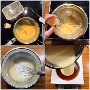 Die Gelatine einweichen. Milch und Sahne mit dem Glucosesirup in einen Topf geben. Den Zucker mit der Maisstärke vermischen und ebenfalls unterrühren. An dieser Stelle gebe ich bereits die Lebensmittelfarbe hinzu. (Tipp: Die Farbe kontrolliere ich, indem ich die Glasur über einen weißen Gummischaber fließen lasse.) Die Glasur unter Rühren zum Kochen bringen. Einmal kurz aufwallen lassen, vom Herd nehmen und in ein hohes Gefäß gießen. Die gut ausgedrückte Gelatine in der Glasur auflösen und mit einem Stabmixer gut durchpürieren, ohne Luftblasen zu erzeugen. Die Oberfläche der Glasur mit Folie bedecken und über Nacht in den Kühlschrank stellen.